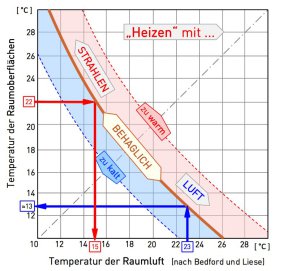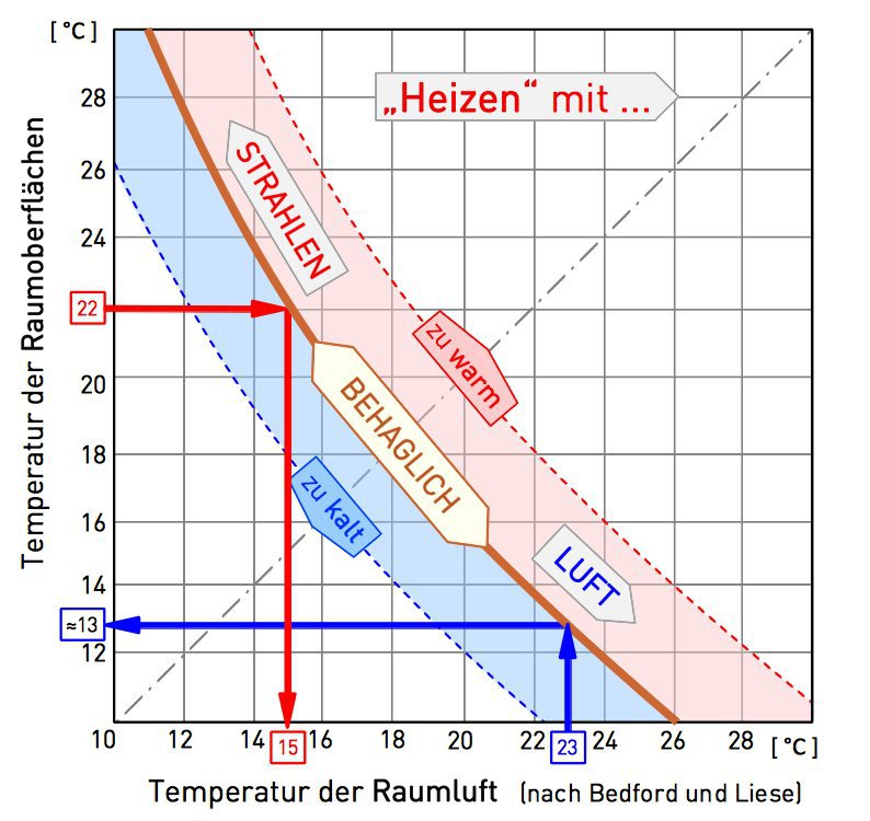 Aus dem Behaglichkeitsdiagramm nach Bedford und Liese lässt sich ablesen, bei welcher Raumluft- und Oberflächentemperatur eine für den Menschen behagliche Empfindung erreicht wird. Dafür entscheidend ist die Oberflächentemperatur der Raumhülle, die bereits bei 18 Grad Celsius Raumlufttemperatur eine gefühlt wesentlich höhere Imagetermperatur und damit Behaglichkeit bewirkt.